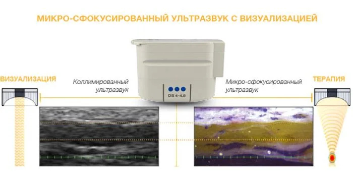 Ультразвук фокусируется в точке под кожей, прогревает её до 60–70°C.