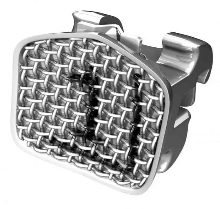 Сетчатое основание кронштейна. Строение и поверхность каждой пластины хорошо ложится на шероховатый рельеф, тем самым обеспечивая плотное крепление к зубам. На основании пластин расположены меловые вставки для адгезии.