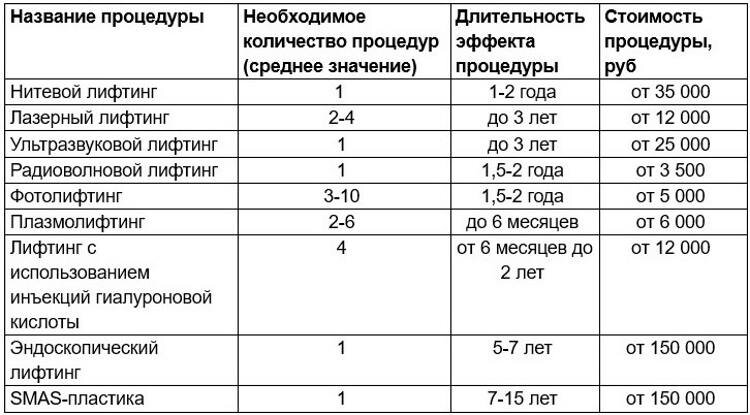 В таблице ниже продемонстрировано сравнение вышеперечисленных методов омоложения по нескольким параметрам, что может упростить вам выбор процедуры.