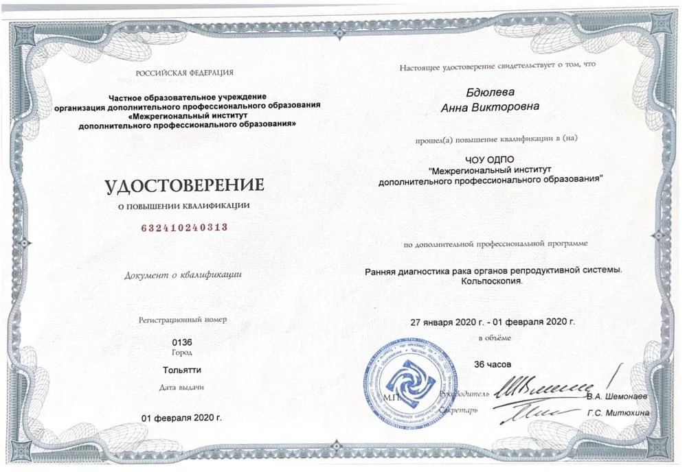 Удостоверение на повышении квалификации по дополнительной профессиональной программе "Ранняя диагностика рака органов репродуктивной системы" VIVI.clinicNovember 1, 2024bduleva