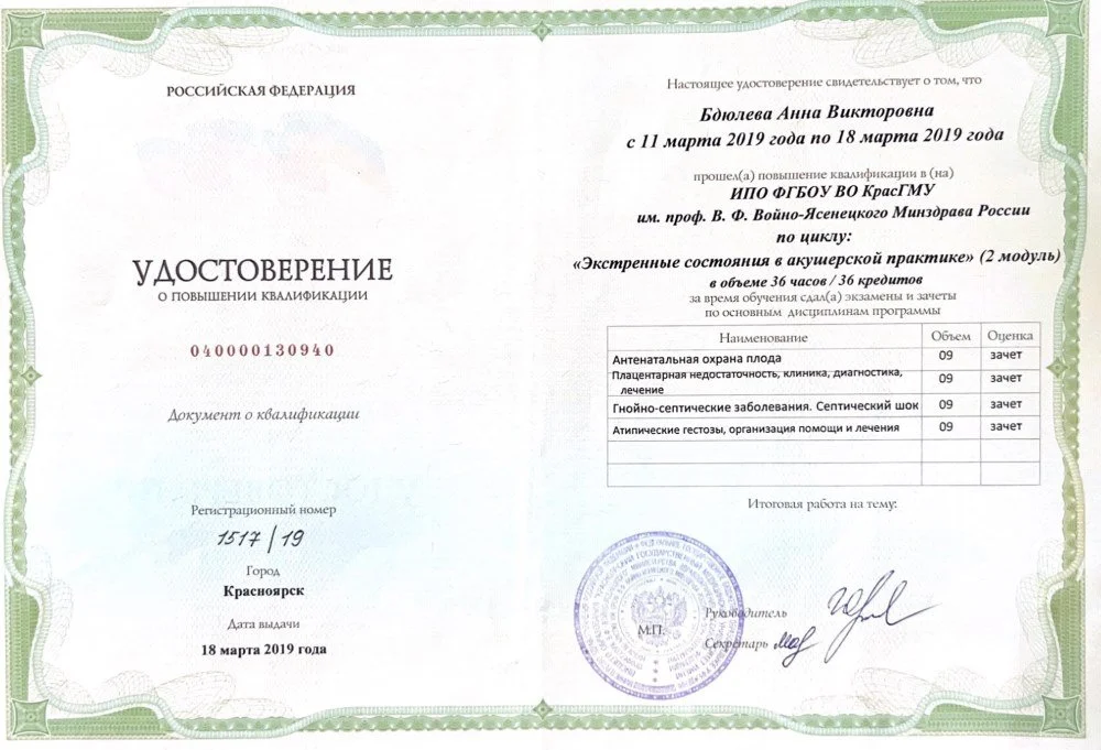 Удостоверение на повышении квалификации по дополнительной профессиональной программе "Экстренные состояния в акушерской практике" VIVI.clinicNovember 1, 2024bduleva