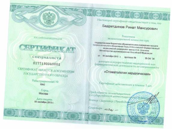 Сертификат специалиста: "Стоматологическая хирургия"
