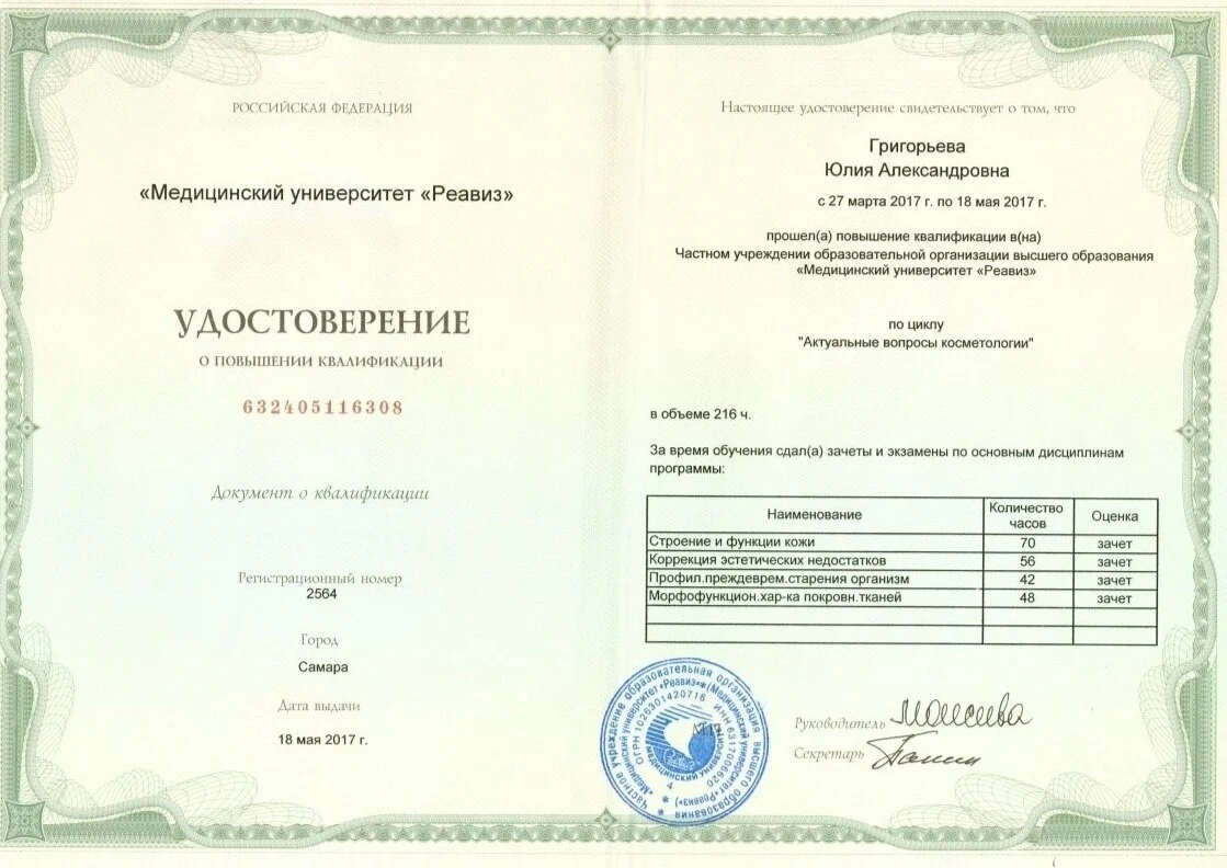 Удостоверение о повышении квалификации по циклу "Актуальные вопросы косметологии" VIVI.clinicApril 20, 2021Григорьева