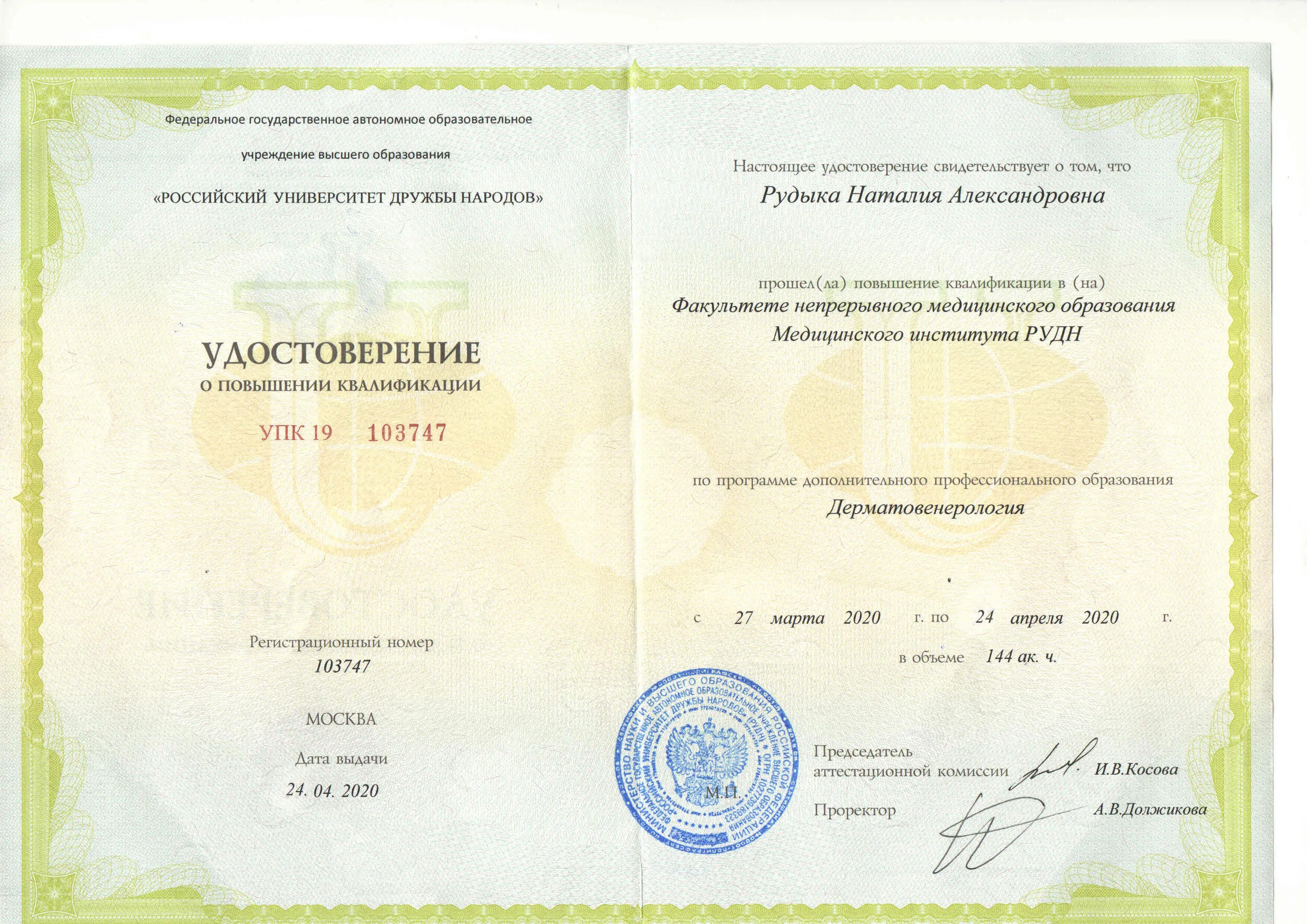 Удостоверение о повышении квалификации по дополнительной профессиональной программе "Косметология"