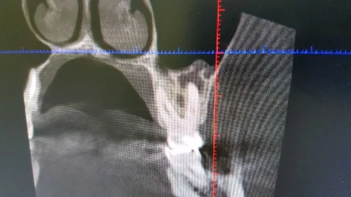 Вовремя непролеченая киста на зубах верхней челюсти может прорвать мембрану гайморовой пазухи и вызвать одонтогенный гайморит. Который не вылечить не удалив зуб. В этом случае стоматологи работают совместно с отоларингологами. Однако здесь уникальность ситуации в том, что снимок сделан когда киста уже прорвала пазуху, но гайморит еще не начался. Сейчас с пациенткой работает стоматолог-терапевт и пытается спасти зуб. Пациентке повезло, обычно пациенты приходят уже с гайморитом.